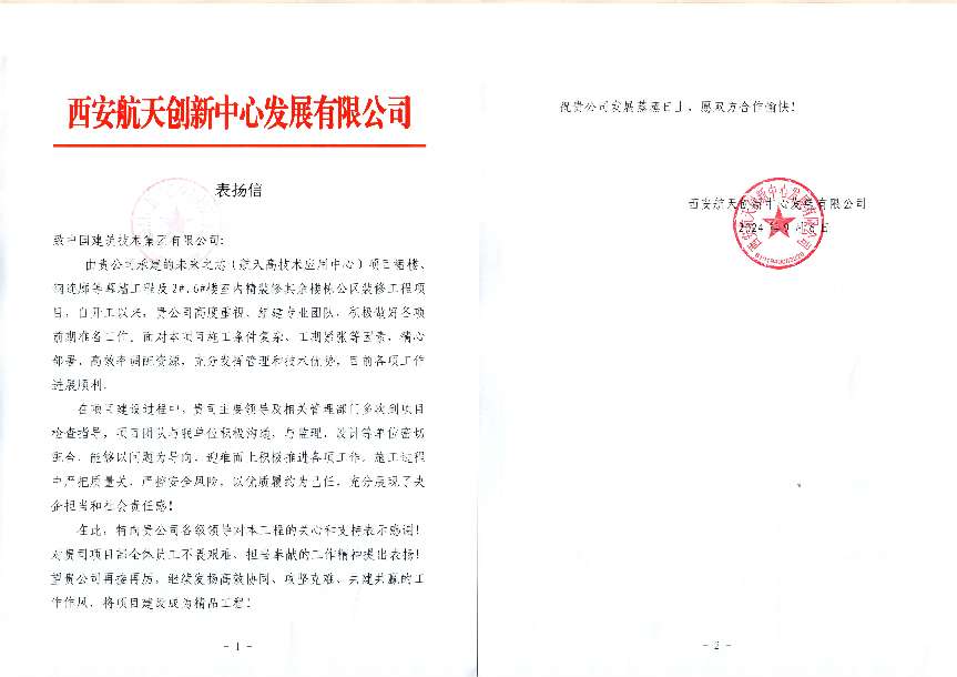 高度評價(jià)!西安航天創(chuàng)新中心發(fā)展公司發(fā)來表揚(yáng)信