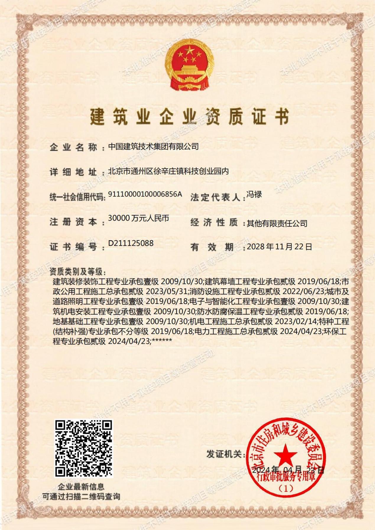 近年來,中國建技致力于完善資質(zhì)平臺建設(shè),形成了覆蓋規(guī)劃、勘察、設(shè)計(jì)、施工、監(jiān)理、咨詢、檢測與服務(wù)等領(lǐng)域的全產(chǎn)業(yè)鏈資質(zhì)矩陣。勘察設(shè)計(jì)領(lǐng)域,擁有工程勘察專業(yè)類(巖土工程)甲級、建筑行業(yè)(建筑工程)甲級、風(fēng)景園林工程設(shè)計(jì)專項(xiàng)甲級、城鄉(xiāng)規(guī)劃編制甲級、土地規(guī)劃乙級、測繪工程測量乙級、勞務(wù)類(工程鉆探)乙級等多項(xiàng)資質(zhì);工程施工領(lǐng)域,擁有建筑工程施工壹級、市政公用工程貳級、機(jī)電工程施工貳級、電力工程施工貳級四項(xiàng)總承包資質(zhì);鋼結(jié)構(gòu)、地基基礎(chǔ)、裝修裝飾、機(jī)電安裝、道路照明、電子與智能化等專業(yè)承包壹級資質(zhì);建筑幕墻、消防設(shè)施、防水防腐保溫等專業(yè)承包貳級資質(zhì);工程監(jiān)理領(lǐng)域,具備屋建筑工程監(jiān)理甲級資質(zhì),開創(chuàng)了以科研引領(lǐng)、設(shè)計(jì)助力、施工驅(qū)動的一體化經(jīng)營新局面。