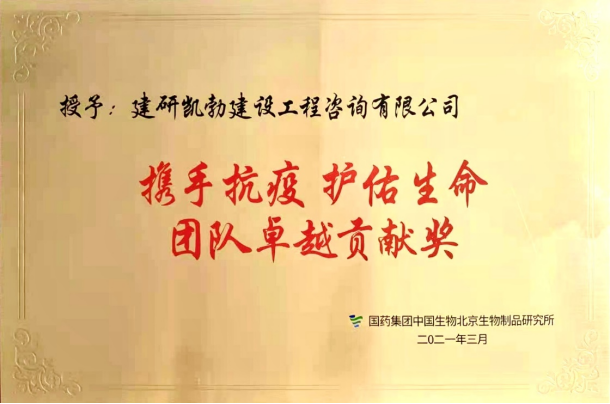 3月27日,集團公司下屬子公司建研凱勃建設(shè)工程咨詢有限公司(以下簡稱“建研凱勃”)榮獲國藥集團中國生物北京生物制品研究所頒發(fā)的“攜手抗疫護佑生命”團隊卓越貢獻(xiàn)獎。