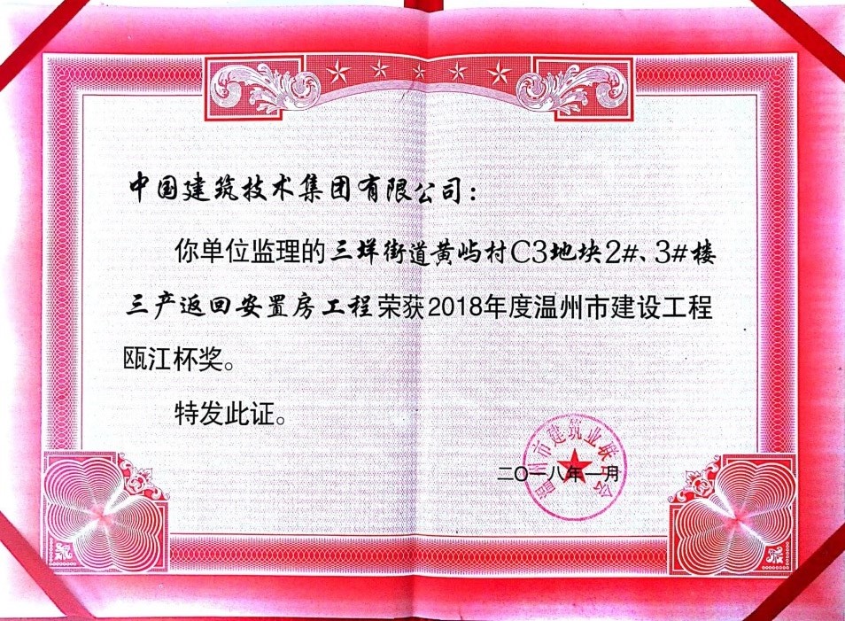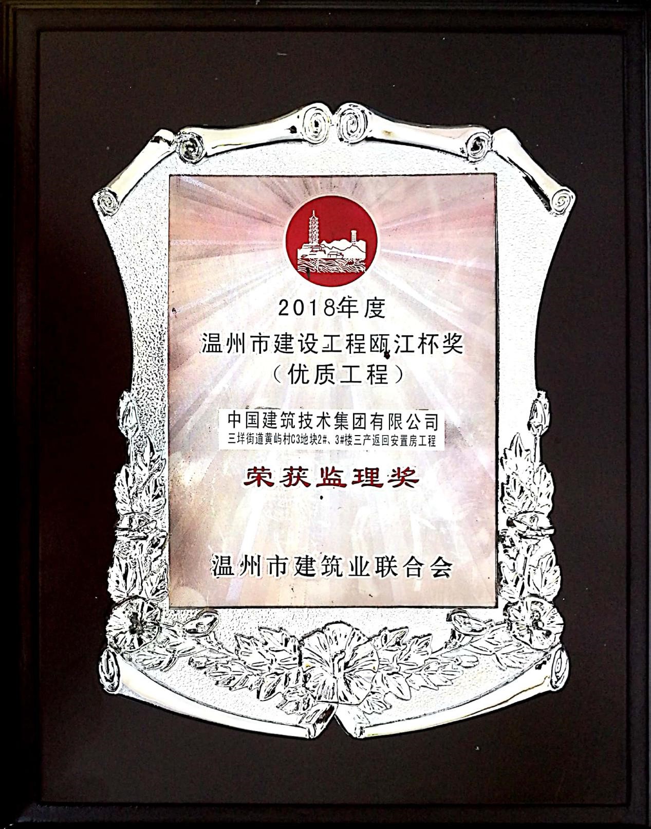 ? ? ? ?近日,溫州住建委、溫州市建筑業(yè)聯(lián)合會召開表彰大會。溫州分公司承攬的“溫州市三垟街道黃嶼村C3地塊2#3#樓三產(chǎn)返回安置房”工程監(jiān)理項目榮獲2018年度溫州市優(yōu)質(zhì)工程“甌江杯”獎。?