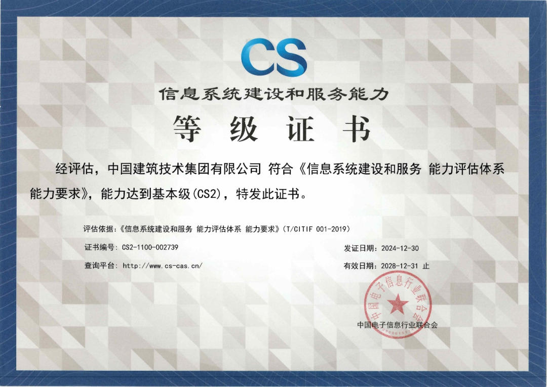近日,中國建技成功通過中國電子信息行業(yè)聯(lián)合會評審,榮獲CS2信息系統(tǒng)建設(shè)和服務(wù)能力認證。這是中國建技繼質(zhì)量、環(huán)境、職業(yè)健康安全、信息技術(shù)服務(wù)、信息安全管理體系認證后,獲得的又一項國家級權(quán)威認證。