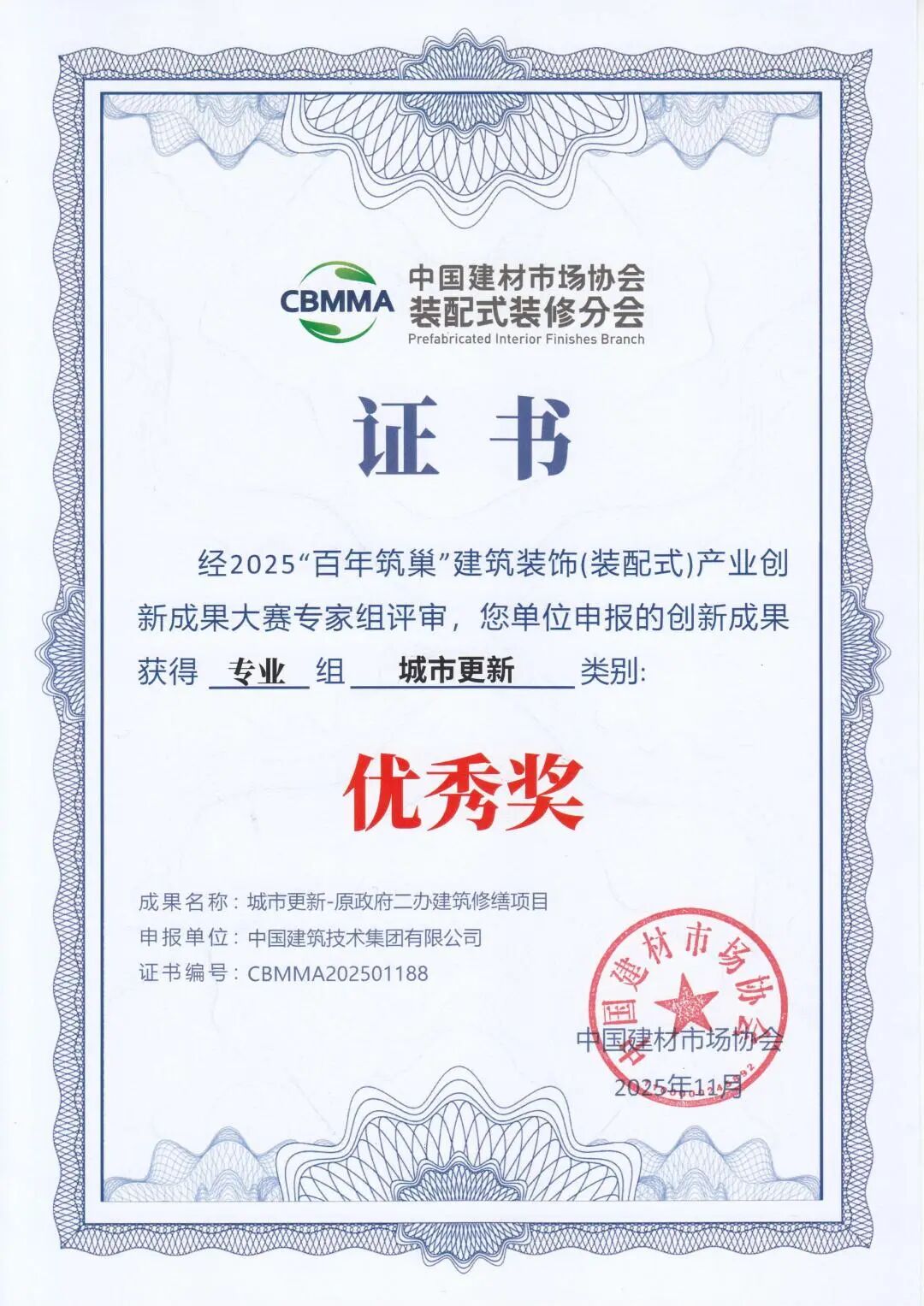 11月13日,由中國建材市場協(xié)會、中國建材市場協(xié)會裝配式裝修分會主辦的2025首屆裝配式裝修產(chǎn)業(yè)大會在浙江海寧會展中心舉行。中國建技所屬三個(gè)項(xiàng)目在大會同期舉辦的2025“百年筑巢”建筑裝飾(裝配式)產(chǎn)業(yè)創(chuàng)新成果大賽中獲獎。