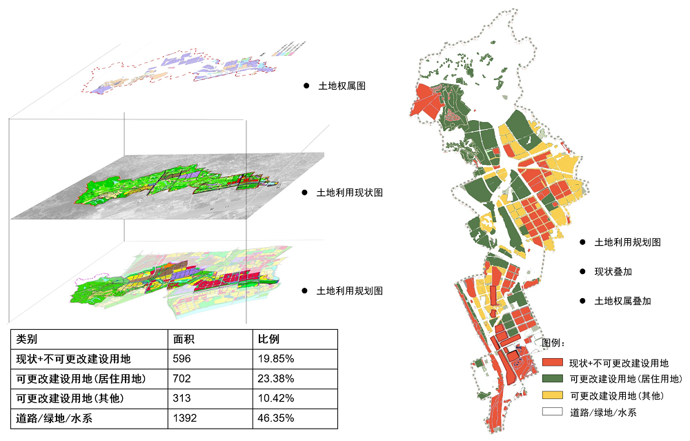 2.?土地情況梳理——對(duì)土地利用現(xiàn)狀情況、權(quán)屬情況、規(guī)劃情況進(jìn)行三者疊加,結(jié)合產(chǎn)業(yè)發(fā)展方向及文化景點(diǎn)策劃,梳理水系及考慮產(chǎn)城配套,局部調(diào)整用地性質(zhì)。