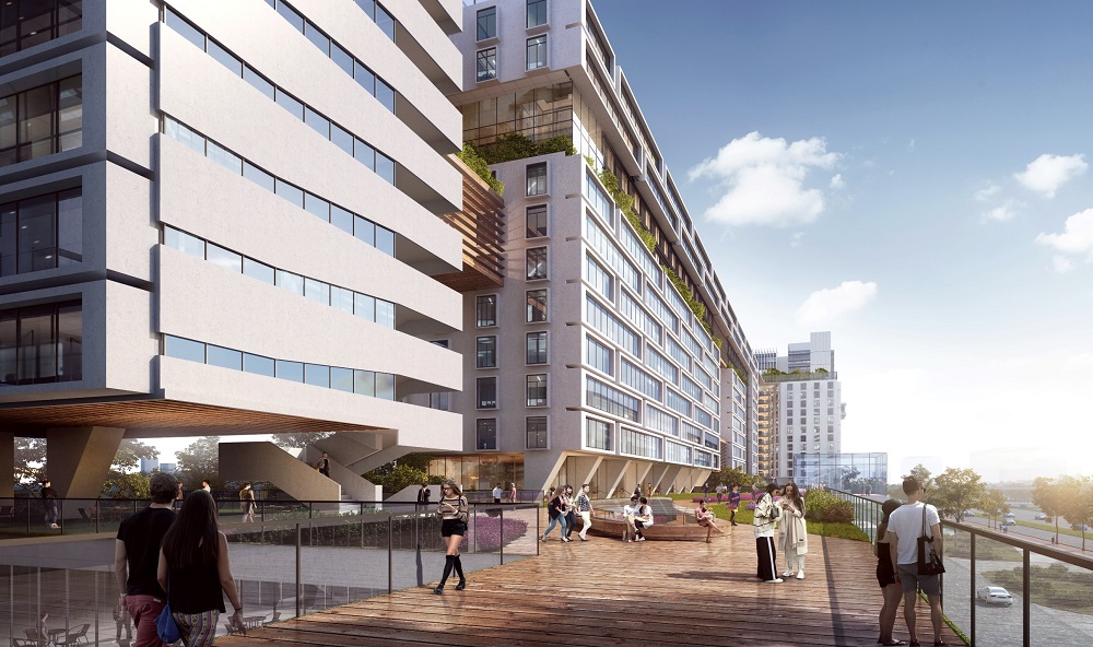 活力天街場景——構(gòu)思利用300余米長的架空平臺加上400余米長起伏的景觀步道,形成總長800米、貫穿整個基地的帶狀連續(xù)步行空間(天街),避開喧囂,開放視野,一路通達(dá),體驗活力。