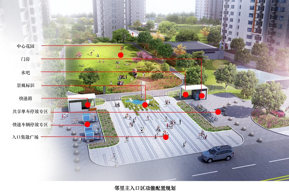 主入口實行人車分流組織,設(shè)置集散廣場、景觀標識和中心花園。精細化布局門房、快遞箱、水吧、共享單車與快遞車輛停放專區(qū),形成功能強大的新型住區(qū)入口服務(wù)系統(tǒng)。