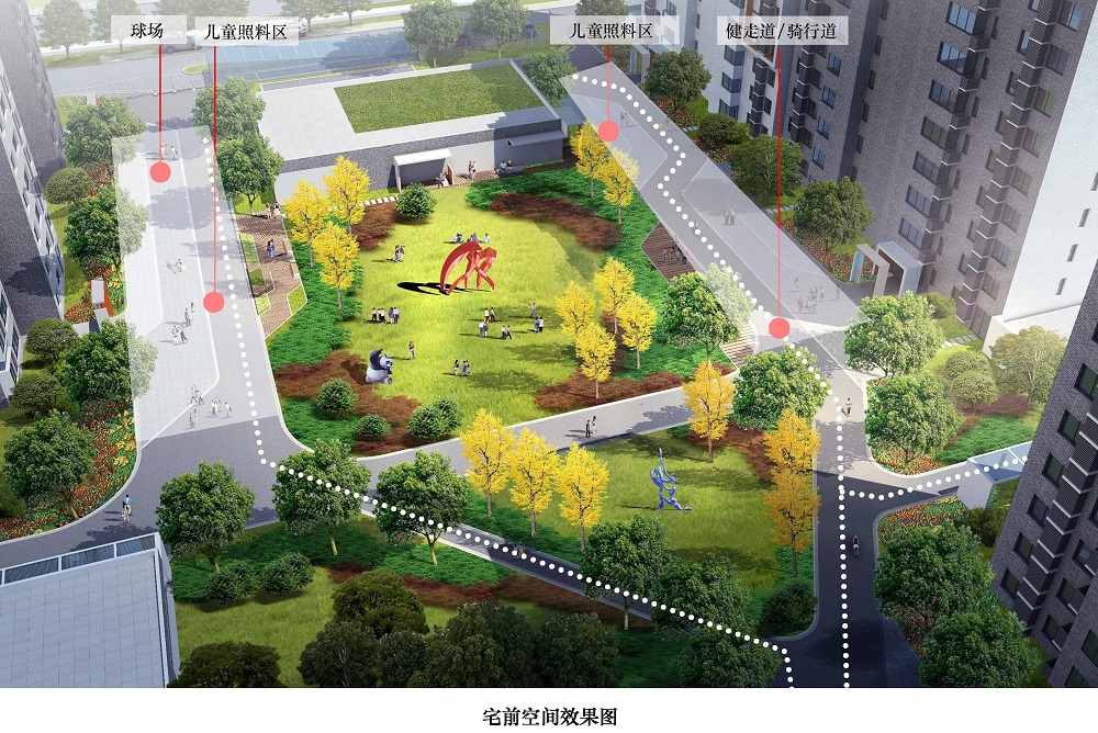 利用宅前消防登高場地規(guī)劃打球、健走、騎行和兒童照料等內(nèi)容,將宅前空間作為單元住戶的交往活力場所?;顒訄龅赝鈹U,結(jié)合綠化布置休閑座椅、花池廊架和文化藝術(shù)裝置,合理布局自行車棚、信報箱、垃圾收集箱和配電室等項設(shè)施。單元樓門設(shè)置入口標識和門禁,居民活動也能對樓宇安全發(fā)揮良好的監(jiān)控作用。