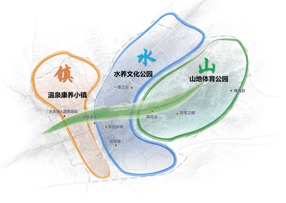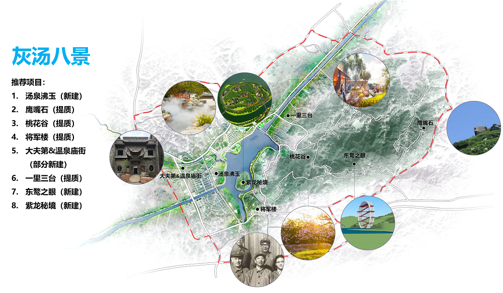 規(guī)劃形成“兩公園一小鎮(zhèn)、八景點(diǎn)一通廊”的空間結(jié)構(gòu),以紫龍湖為核心打造溫泉康養(yǎng)文化公園;結(jié)合東鶩山打造山地體育公園;結(jié)合灰湯鎮(zhèn)區(qū)打造灰湯溫泉民俗小鎮(zhèn);打“湯泉沸玉、鷹嘴石、桃花谷、將軍樓、大夫第&溫泉廟街、一里三臺(tái)、東鶩之眼、紫龍秘境”灰湯八景;依托烏江、紫龍湖、東鶩山形成山水景觀視線通廊。