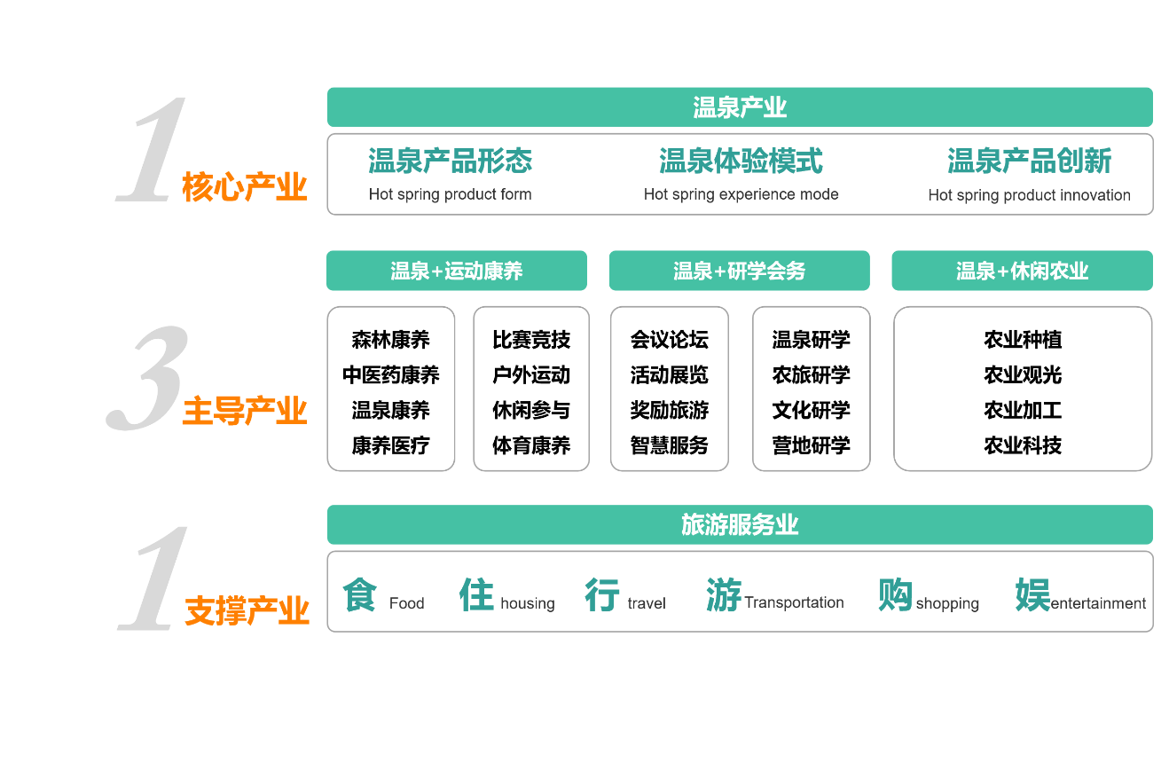 以“溫泉”為核心,以“溫泉+運(yùn)動(dòng)康養(yǎng)”、“溫泉+研學(xué)會(huì)務(wù)”、“溫泉+休閑農(nóng)業(yè)”為三大主導(dǎo)產(chǎn)業(yè)以旅游服務(wù)業(yè)為支撐,構(gòu)建“1+3+1”的產(chǎn)業(yè)體系。