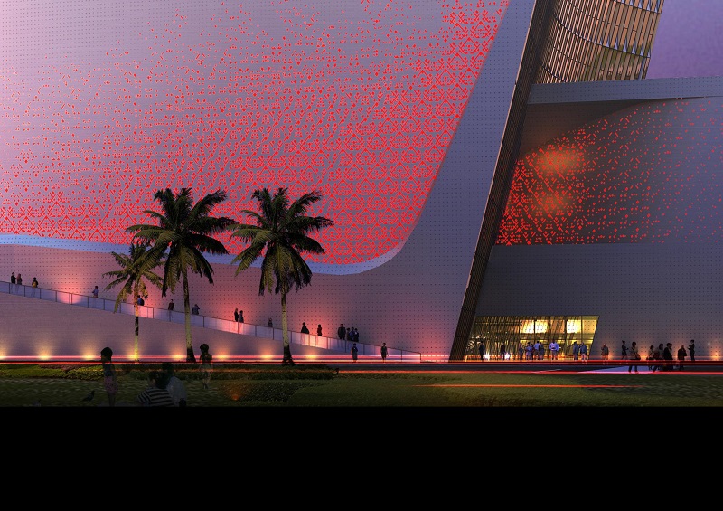建筑外飾面以穿孔金屬幕墻及玻璃幕墻為主,強調(diào)建筑虛實對比,造型整體舒展大氣,極具動態(tài)。建筑立面注重細(xì)部處理,淺銀灰色金屬質(zhì)感的菱形穿孔鋁板,以若干通透率的組合,拼接成漸變過渡的視覺效果,細(xì)節(jié)融入海南黎錦圖案意象,寓意地域非遺傳統(tǒng)文化的精髓。鋁板開孔圖案襯以夜景燈,晝間夜間將呈現(xiàn)不同的立面效果。